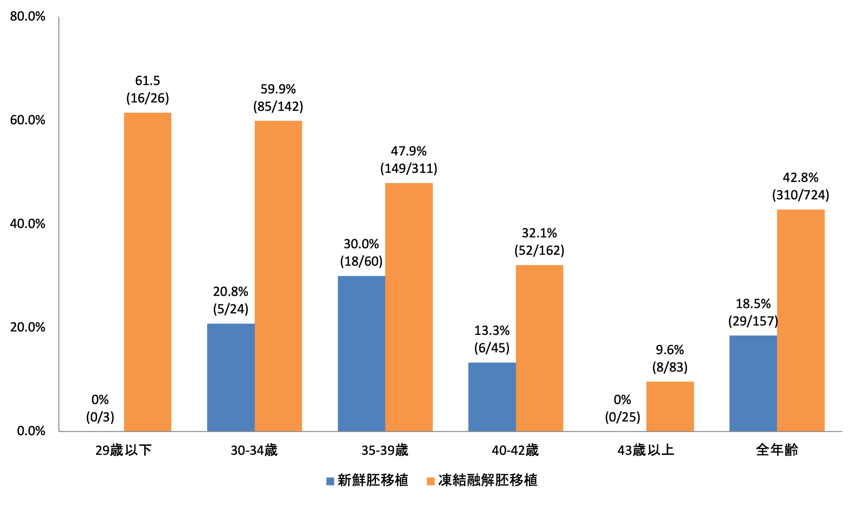 そのため、初期胚の中には、胚盤胞に育たないかもしれない胚も含まれていますので、妊娠率を計算しますとグラフのような差異が見られます。