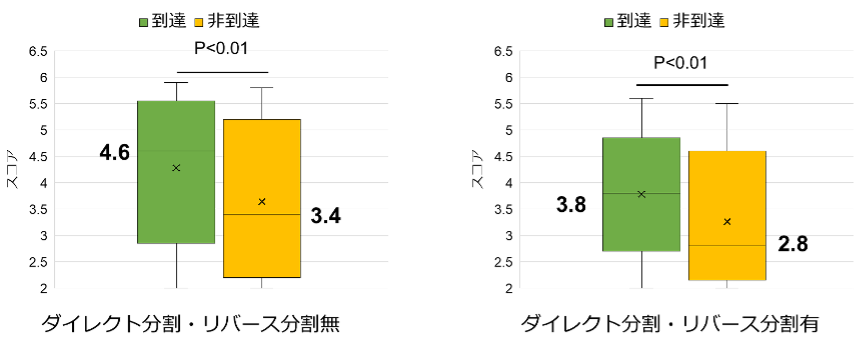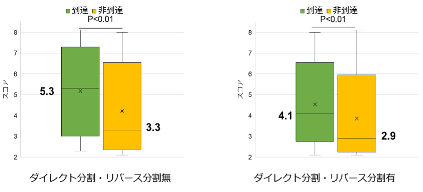 また、ダイレクト分割(1つの細胞が通常は2つに分かれるところ、3つ以上の細胞に分かれる現象)や、リバース分割(2つ以上の細胞が1つに戻る現象)といった異常分割が見られた胚と見られなかった胚で同様の検討を行ったところ、異常分割が見られた胚のスコア自体は異常分割が見られなかった胚と比較すると低くなりますが、その中でも胚盤胞に到達した胚と到達しなかった胚でスコアに差が出ており、異常分割が見られた胚でもiDAScore™を用いて胚盤胞到達予測が可能であることが示唆されました。