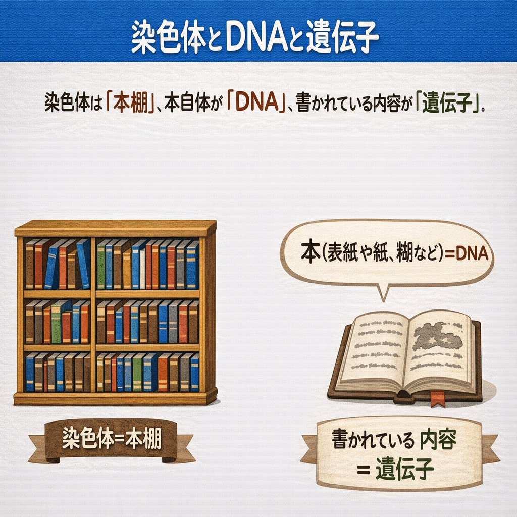 この3つは体を構成する情報を表している言葉ですが、見ているものが違います。染色体は「本棚」で、本(本を構成する表紙や紙、糊、インクなど)が「DNA」、書かれている内容が「遺伝子」です。